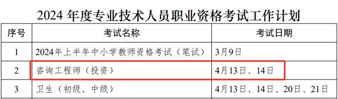 人力资源社会保障部办公厅关于2024年度专业技术人员职业资格考试工作计划及有关事项的通知已发布,明确2024年咨询工程师考试时间为4月13日、14日。